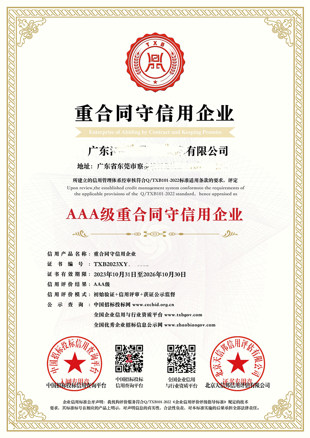 3A认证AAA级重合同守信用企业证书有效期三年。